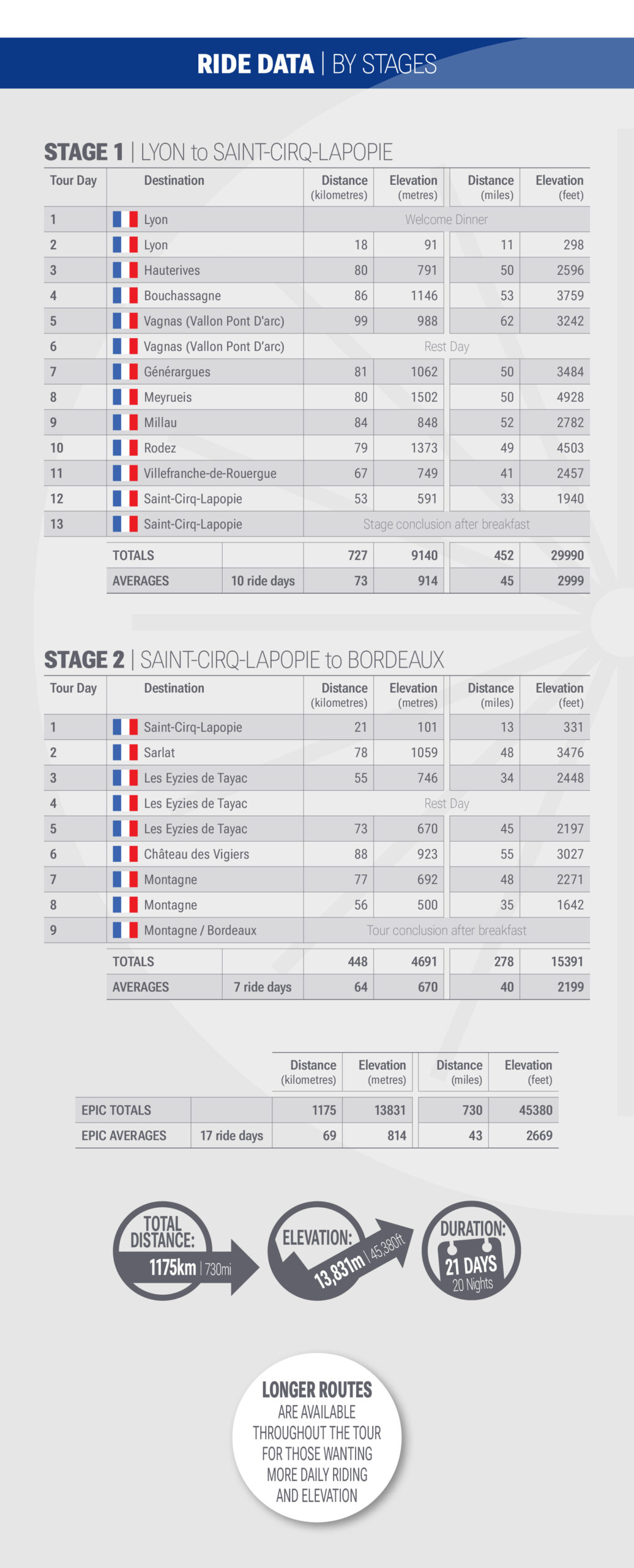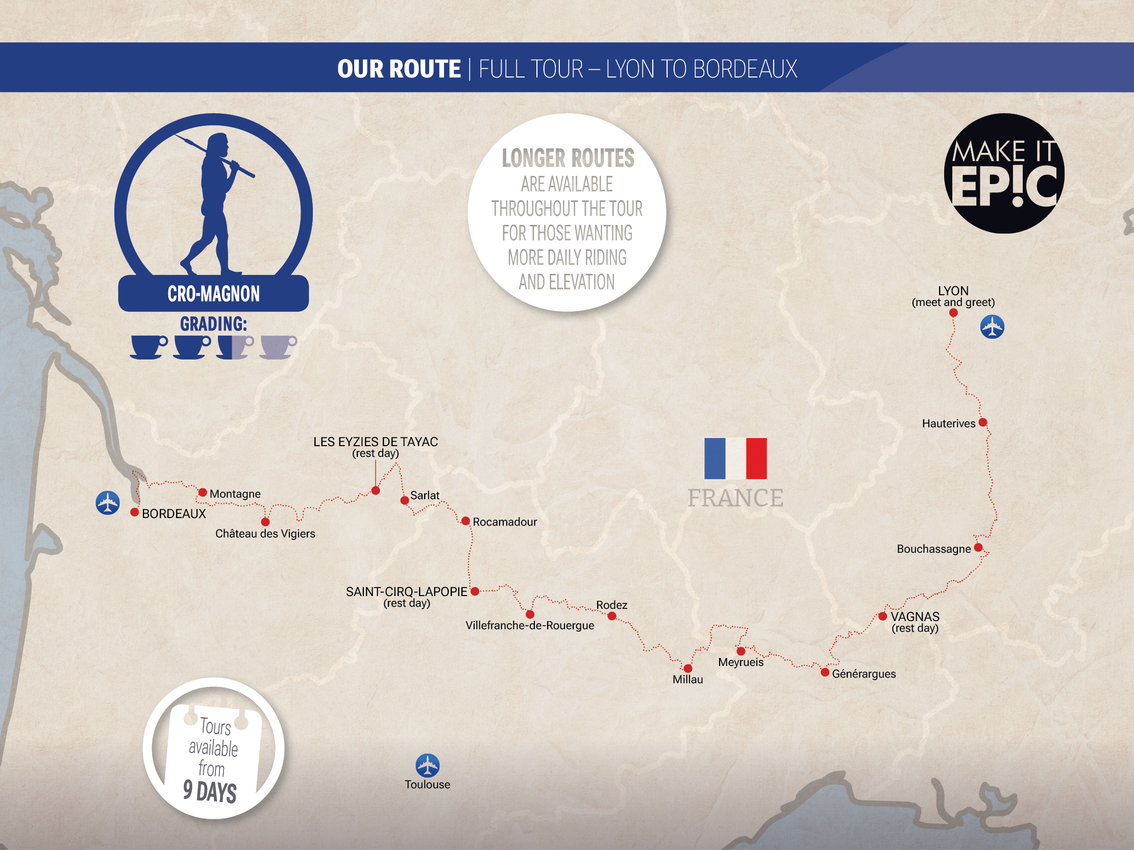 The tour can be taken on as a single Epic over 20 days or as one of two stages – Lyon to Saint-Cirq Lapopie (12 days) or Saint-Cirq Lapopie to Bordeaux (8 days)