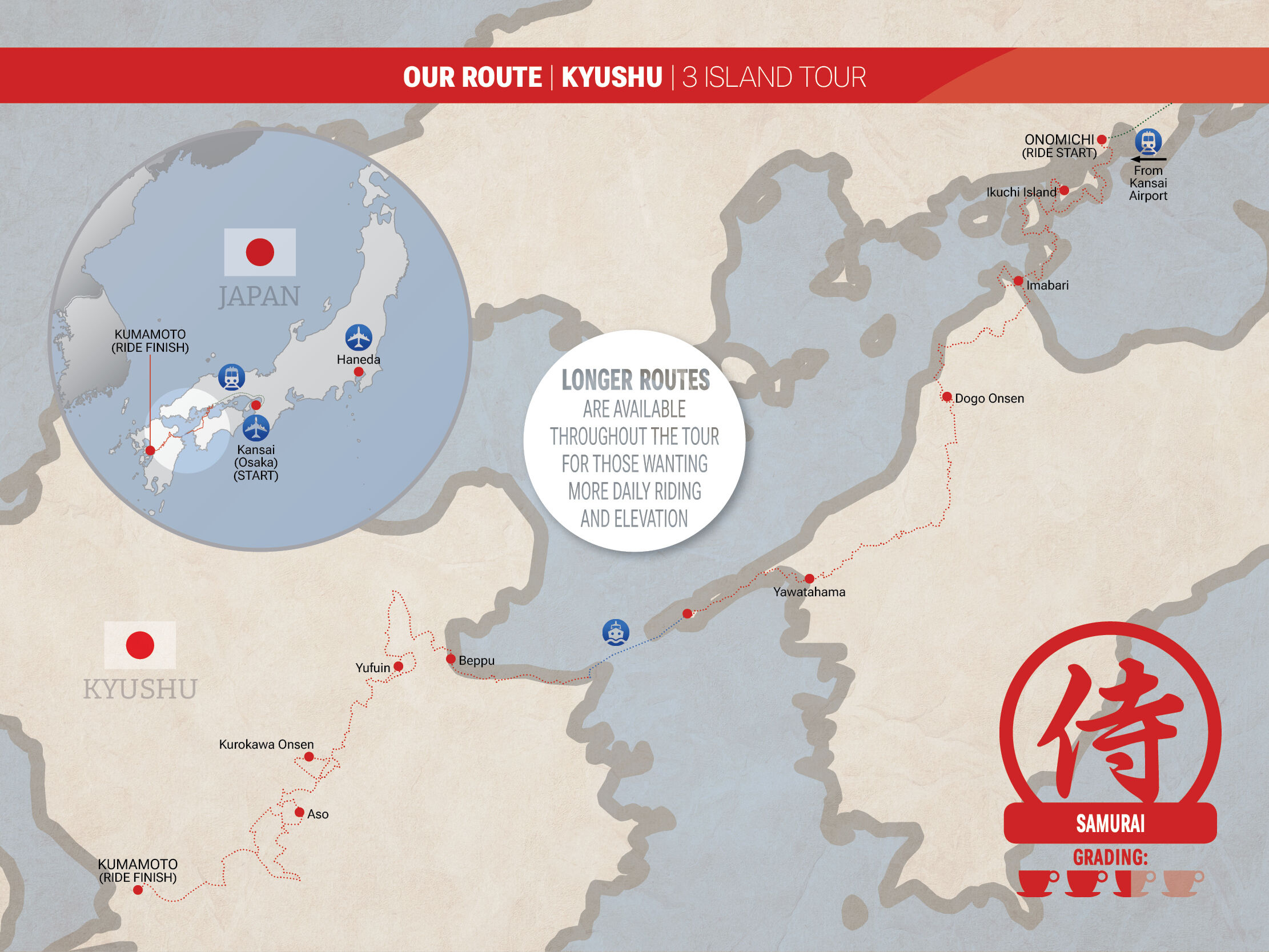 The 5-hour train journey from Kumamoto to Kansai Airport is included. Guests will travel by train, and guides will transfer bikes in thevan – it’s a day and a half drive back to Kansai. Bike boxes/bags will be stored at Kansai Nikko Airport Hotel for the duration of the tour.