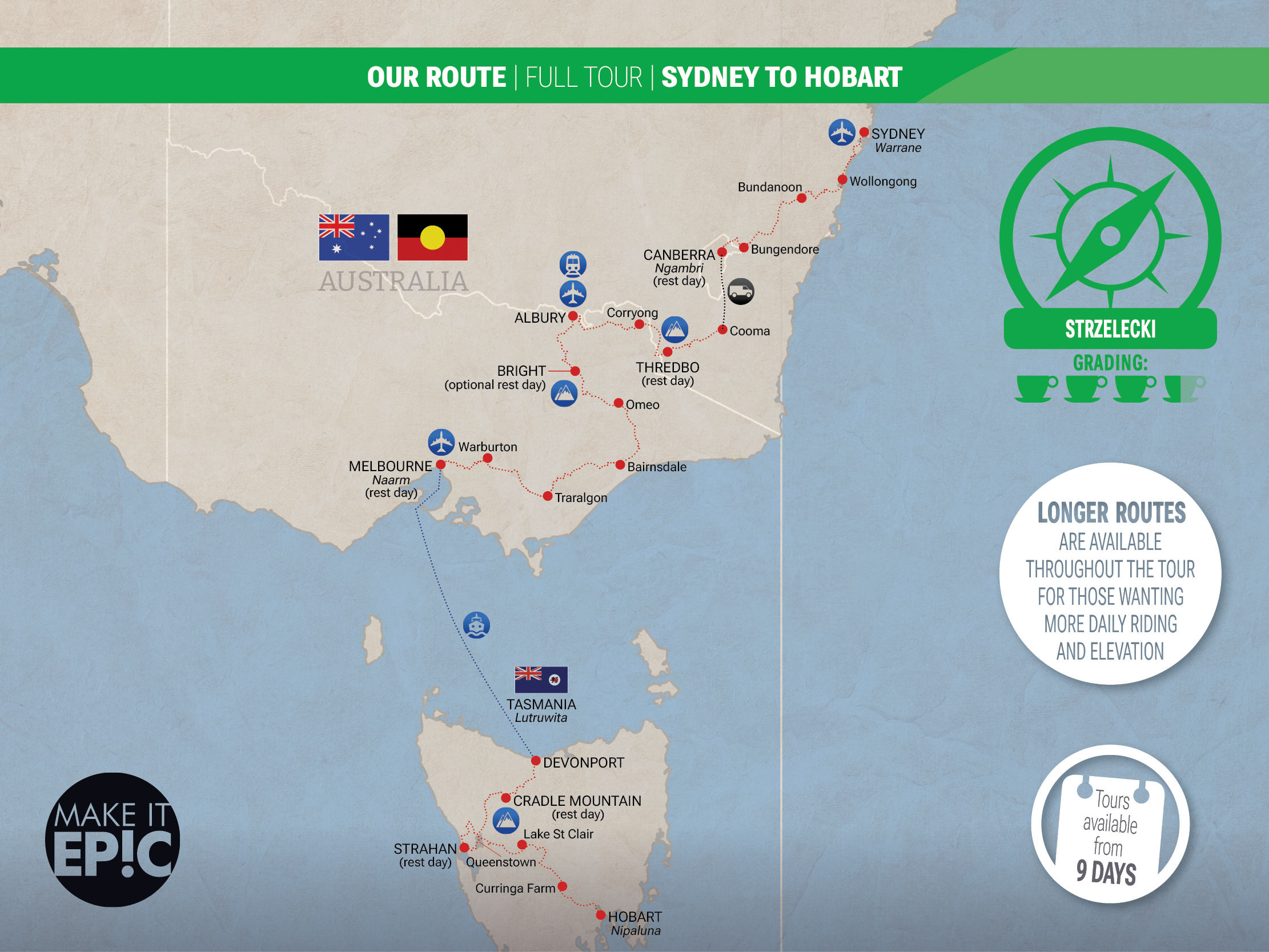 | Epic Strzelecki – Sydney to Hobart | 12th Feb | 12th March | 29 (28 nights) | US$16,100 |